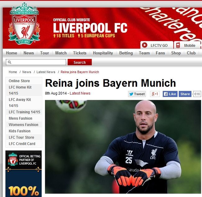 리버풀은 9일(이하 한국시간) 홈페이지를 통해 "레이나가 뮌헨으로 이적했다"고 밝표했다. 리버풀은 "지난 8년 동안 리버풀서 활약한 레이나는 좋은 결과를 얻는 등 큰 활약을 선보였다. 뮌헨으로 완전이적하게 되면서 아쉬움이 남는다"고 밝혔다.