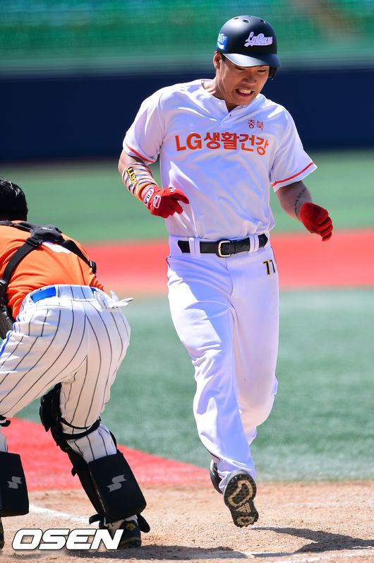 9일 전북 군산 월명야구장에서 열린 제1회 KBO총재배 시도대항 전국 직장인 야구대회 전남 GS칼텍스와 충북 LG 생활건강의 경기, 5회말 충북 LG생활건강 박창현이 내야안타를 날린 후 전남 GS칼텍스 실책 두개를 틈타 득점하고 있다.