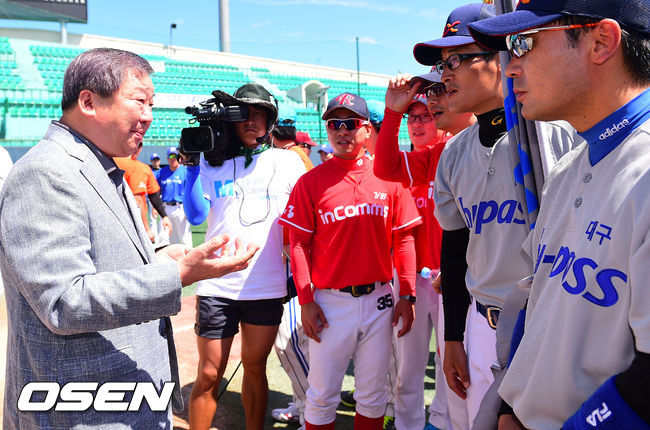 9일 전북 군산 월명야구장에서 열린 제1회 KBO총재배 시도대항 전국 직장인 야구대회 개막식에 앞서 KBO 구본능 총재가 선수들을 격려하고 있다.
