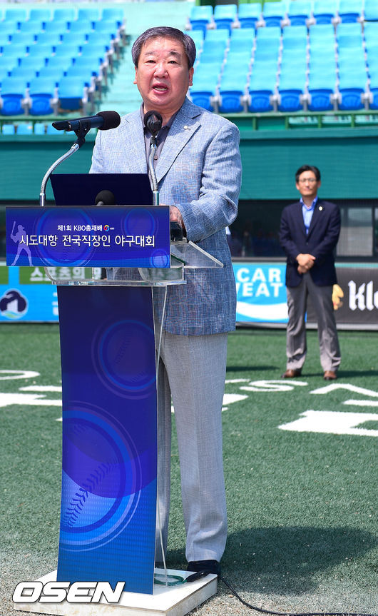 9일 전북 군산 월명야구장에서 열린 제1회 KBO총재배 시도대항 전국 직장인 야구대회 개막식에 앞서 KBO 구본능 총재가 선수들을 격려하고 있다.