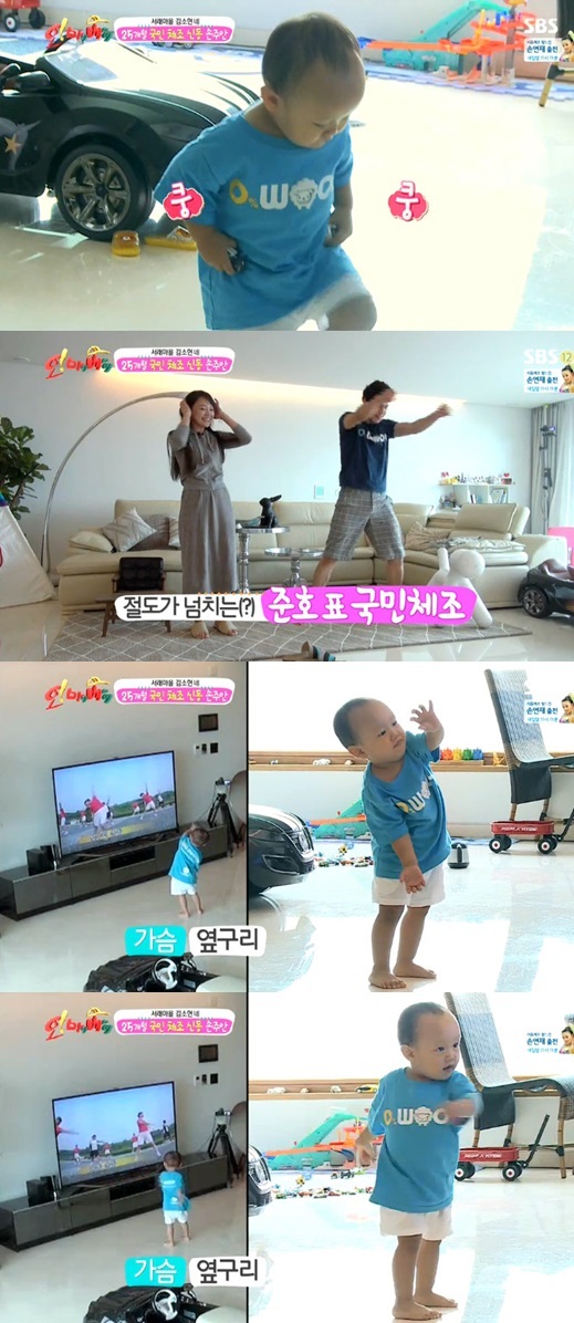 주안이는 9일 오후 방송된 SBS 예능프로그램 '오 마이 베이비'에서 국민 체조 영상을 보면서 앙증맞게 따라했다. 아빠 손준호는 즐거워하는 주안이보다 더 신나서 국민 체조를 코믹하게 따라해 웃음을 자아냈다.