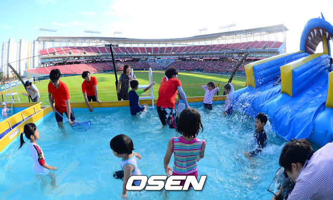 9일 광주-기아 챔피언스필드에서 열린 2014 한국야쿠르트 세븐 프로야구 KIA 타이거즈와 롯데 자이언츠의 경기, KIA타이거즈가 휴가철 주말 홈경기를 맞아 국내 최초로 야구장 물놀이 축제를 열었다.