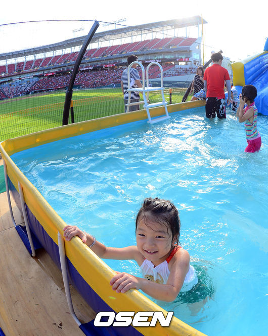 9일 광주-기아 챔피언스필드에서 열린 2014 한국야쿠르트 세븐 프로야구 KIA 타이거즈와 롯데 자이언츠의 경기, KIA타이거즈가 휴가철 주말 홈경기를 맞아 국내 최초로 야구장 물놀이 축제를 열었다.