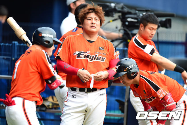 경기에 앞서 한화 이용규, 김태균, 정근우가 이야기를 나누며 경기를 준비하고 있다.