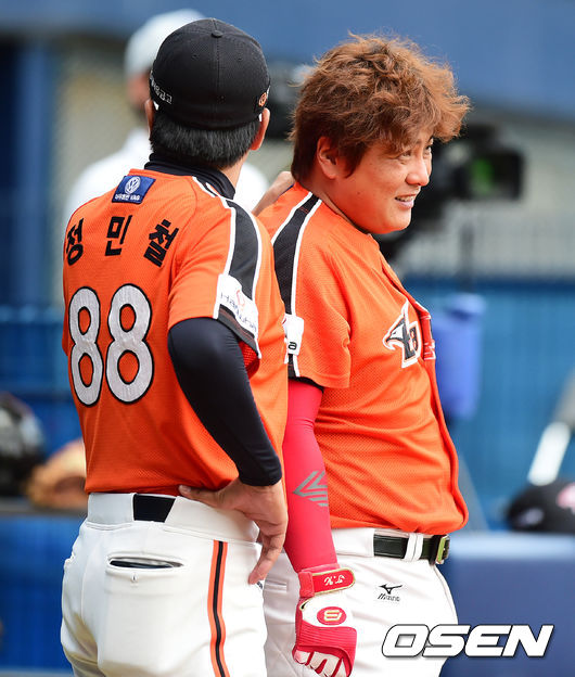 경기에 앞서 한화 정민철 코치가 김태균의 목을 마사지하며 이야기를 나누고 있다.