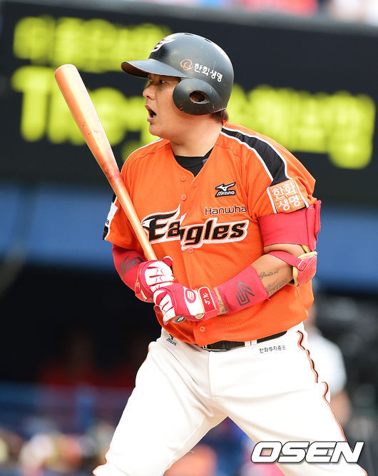 1회초 1사 1,3루에서 한화 김태균이 삼진으로 물러나며 아쉬워하고 있다.
