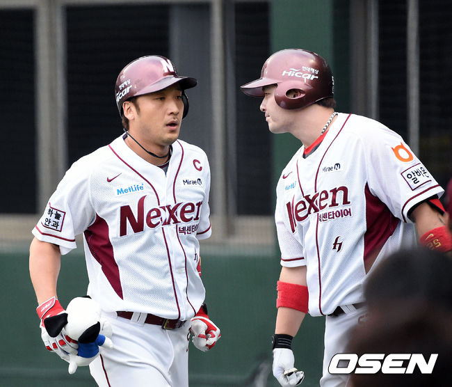 9일 오후 목동 야구장에서 열린 '2014 한국야쿠르트 세븐 프로야구' 넥센 히어로즈와 삼성 라이온즈 경기,1회말 1사 이택근 솔로 홈런을 날리고 박병호의 환영을 받고 있다.