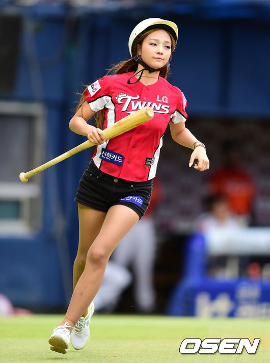 LG 치어리더 강윤이가 배트걸로 변신, 배트와 보조장비를 챙겨 그라운드를 나서고 있다.