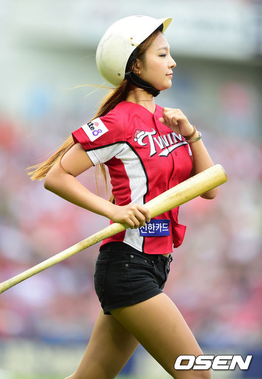 LG 치어리더 강윤이가 배트걸로 변신, 배트와 보조장비를 챙겨 그라운드를 나서고 있다.