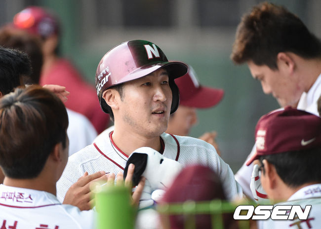 9일 오후 목동 야구장에서 열린 '2014 한국야쿠르트 세븐 프로야구' 넥센 히어로즈와 삼성 라이온즈 경기,1회말 1사 유한준 백투백 홈런을 날리고 덕아웃 동료들의 축하를 받고 있다.