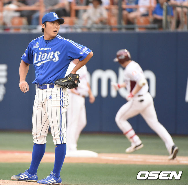 9일 오후 목동 야구장에서 열린 '2014 한국야쿠르트 세븐 프로야구' 넥센 히어로즈와 삼성 라이온즈 경기,1회말 1사 이태근에 이어 유한준에게 백투백 홈런을 허용한 삼성 배영수가 아쉬워하고 있다.