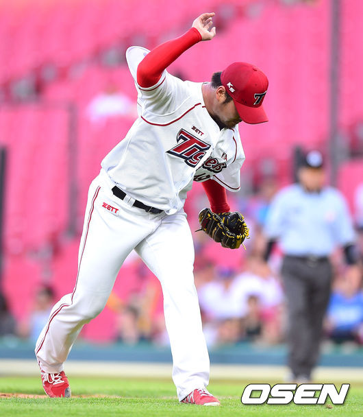 9일 광주-기아 챔피언스필드에서 열린 2014 한국야쿠르트 세븐 프로야구 KIA 타이거즈와 롯데 자이언츠의 경기,2회초 무사 2루 실점 위기를 넘긴 KIA 선발투수 김진우가 투구동작을 하며 더그아웃으로 들어가고 있다.