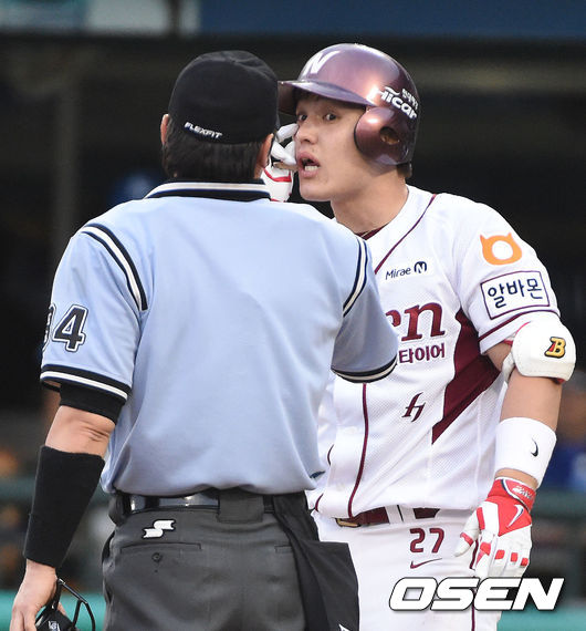 9일 오후 목동 야구장에서 열린 '2014 한국야쿠르트 세븐 프로야구' 넥센 히어로즈와 삼성 라이온즈 경기,2회말 1사 2,3루 박동원 스퀴즈번트를 하면서 타구가 손에 맞았다며 우효동 구심에게 이야기 하고 있다.