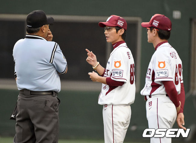 9일 오후 목동 야구장에서 열린 '2014 한국야쿠르트 세븐 프로야구' 넥센 히어로즈와 삼성 라이온즈 경기,2회말 1사 2,3루 염경엽 감독이 박동원 스퀴즈번트 파울타구에 대해 심판들과 이야기를 하고 있다.