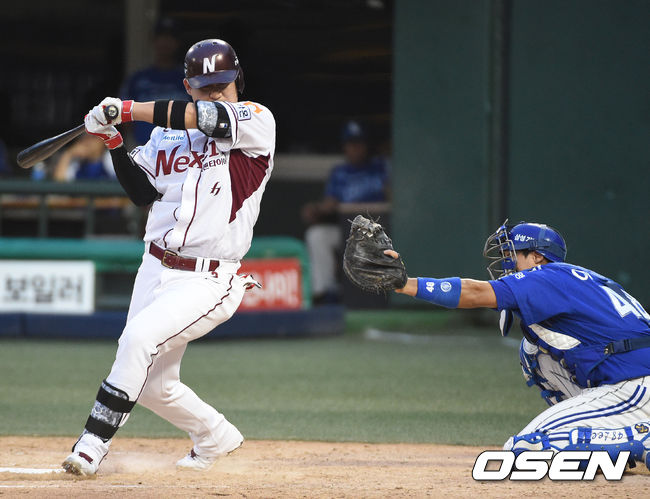 9일 오후 목동 야구장에서 열린 '2014 한국야쿠르트 세븐 프로야구' 넥센 히어로즈와 삼성 라이온즈 경기,3회말 2사 1,2루 김민성 배트가 돌아가며 삼진아웃 처리되고 있다.
