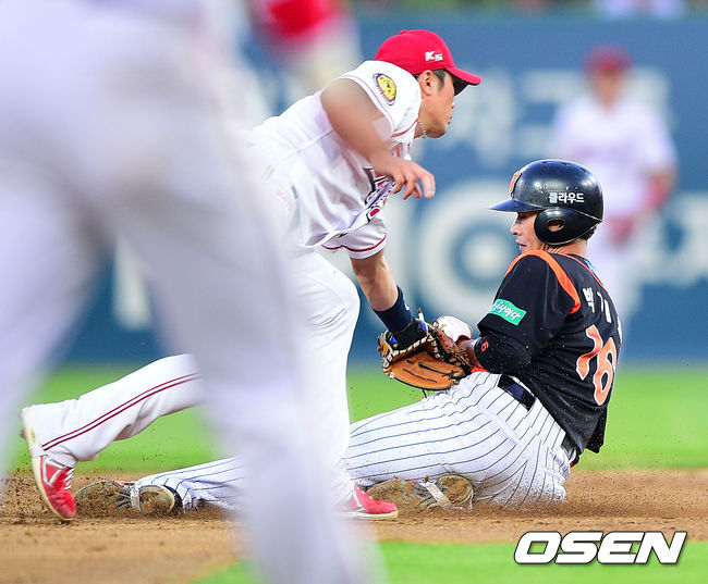 9일 광주-기아 챔피언스필드에서 열린 2014 한국야쿠르트 세븐 프로야구 KIA 타이거즈와 롯데 자이언츠의 경기,4회초 1사 1루 롯데 하준호의 타석때 1루 주자 박기혁이 도루시도했지만 태그아웃되고 있다.
