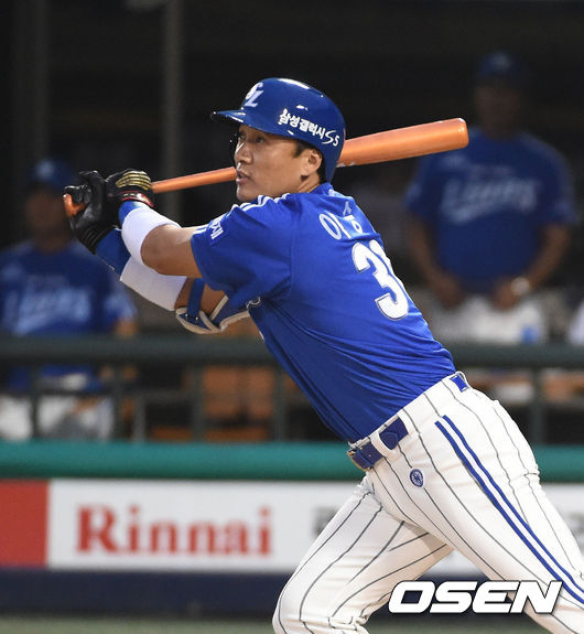9일 오후 목동 야구장에서 열린 '2014 한국야쿠르트 세븐 프로야구' 넥센 히어로즈와 삼성 라이온즈 경기,4회말 무사 만루 이승엽 2타점 적시타를 날리고 있다.