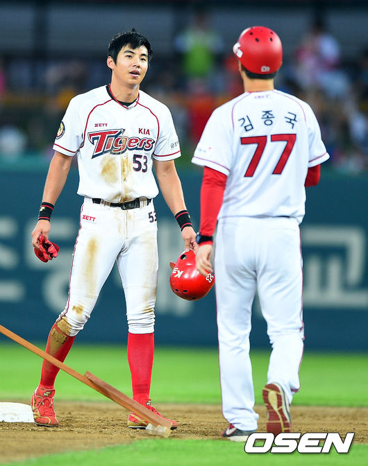 9일 광주-기아 챔피언스필드에서 열린 2014 한국야쿠르트 세븐 프로야구 KIA 타이거즈와 롯데 자이언츠의 경기,4회말 1사 1루 KIA 필의 병살타때 2루에서 포스아웃된 이대형이 아쉬워하고 있다. 이대형은 통산 400도루에 하나만 남겨두고 있다.