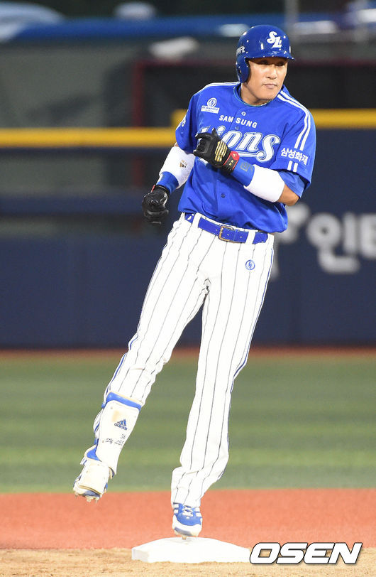 9일 오후 목동 야구장에서 열린 '2014 한국야쿠르트 세븐 프로야구' 넥센 히어로즈와 삼성 라이온즈 경기,4회초 무사 만루 이승엽 2타점 적시타를 날리고 2루에 안착하고 있다.