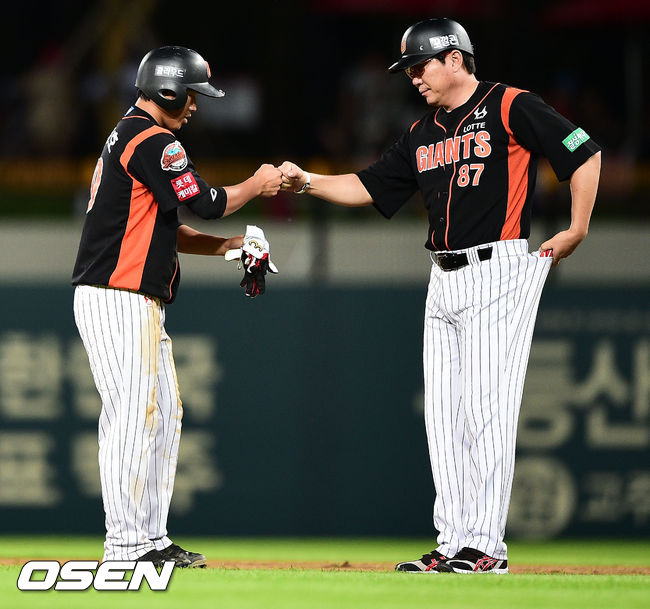 9일 광주-기아 챔피언스필드에서 열린 2014 한국야쿠르트 세븐 프로야구 KIA 타이거즈와 롯데 자이언츠의 경기,6회초 1사 2루 롯데 하준호가 1타점 적시타를 날린뒤 김응국 코치와 하이파이브를 하고 있다.
