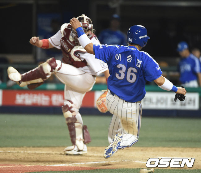 9일 오후 목동 야구장에서 열린 '2014 한국야쿠르트 세븐 프로야구' 넥센 히어로즈와 삼성 라이온즈 경기,5회초 2사 만루 김상수의 적시타때 2루주자 이승엽 홈까지 쇄도 득점을 올리고 있다.