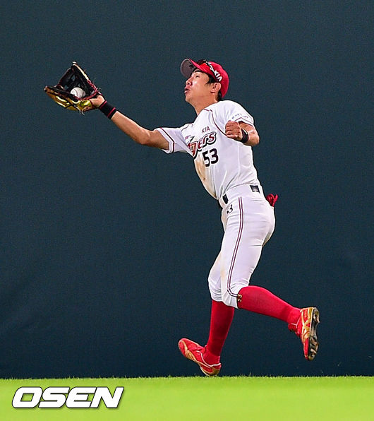 9일 광주-기아 챔피언스필드에서 열린 2014 한국야쿠르트 세븐 프로야구 KIA 타이거즈와 롯데 자이언츠의 경기,6회초 1사 2,3루 롯데 황재균의 동점 희생플라이때 KIA 이대형 중견수가 타구를 잡아내고 있다.