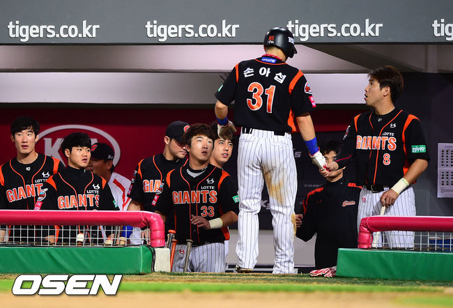 9일 광주-기아 챔피언스필드에서 열린 2014 한국야쿠르트 세븐 프로야구 KIA 타이거즈와 롯데 자이언츠의 경기,6회초 1사 2,3루 롯데 황재균의 동점 희생플라이때 3루 주자 손아섭이 득점 후 동료들의 축하를 받고 있다