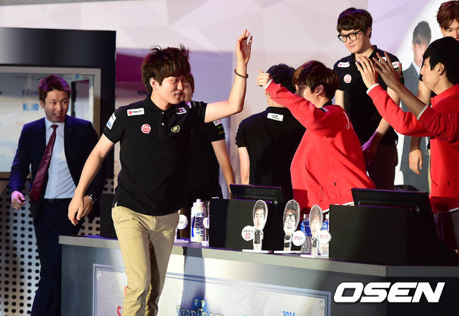결승전 2세트 SKT 원종현과 KT 이영호의 경기, 이영호가 승리를 거둔 뒤 동료들과 하이파이브를 나누며 기뻐하고 있다.