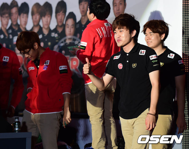 결승전 2세트 SKT 원종현과 KT 이영호의 경기, 이영호가 승리를 거둔 뒤 엄지손가락을 치켜들며 기뻐하고 있다.