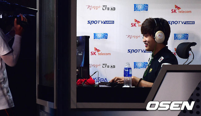 결승전 2세트 SKT 원종현과 KT 이영호의 경기, 이영호가 경기 종료 직전 미소 짓고 있다.