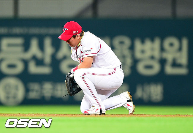 9일 광주-기아 챔피언스필드에서 열린 2014 한국야쿠르트 세븐 프로야구 KIA 타이거즈와 롯데 자이언츠의 경기,8회초 1사 만루 롯데 손아섭의 내야땅볼 타구를 놓치며 병살찬스를 잡지못한 KIA 안치홍이 아쉬워하고 있다.