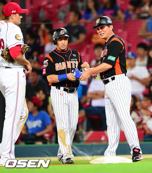 9일 광주-기아 챔피언스필드에서 열린 2014 한국야쿠르트 세븐 프로야구 KIA 타이거즈와 롯데 자이언츠의 경기,8회초 1사 만루 롯데 손아섭이 내야땅볼로 역전 1타점을 올린후 김응국 코치와 하이파이브를 하고 있다.
