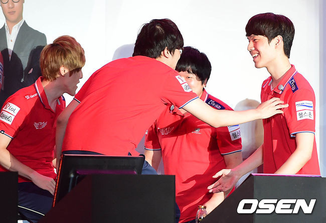 결승전 3세트 SKT 정윤종과 KT 주성욱의 경기, 정윤종이 승리를 거둔 뒤 동료들과 하이파이브를 나누며 미소짓고 있다.