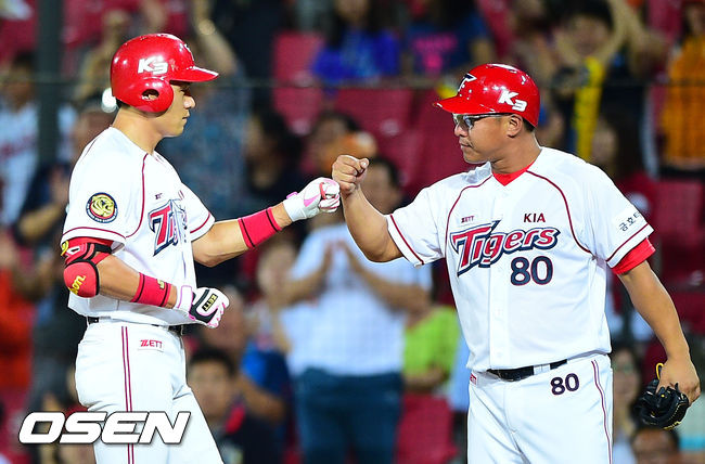 9일 광주-기아 챔피언스필드에서 열린 2014 한국야쿠르트 세븐 프로야구 KIA 타이거즈와 롯데 자이언츠의 경기,8회말 1사 1,2루 KIA 신종길이 동점 1타점 적시타를 날리고 백재호 코치와 하이파이브를 하고 있다.