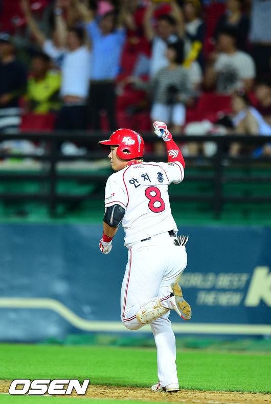 9일 광주-기아 챔피언스필드에서 열린 2014 한국야쿠르트 세븐 프로야구 KIA 타이거즈와 롯데 자이언츠의 경기, 8회말 1사 만루 KIA 안치홍이 만루홈런을 날리고 환호하고 있다.