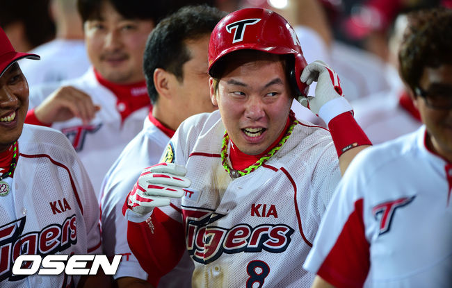 9일 광주-기아 챔피언스필드에서 열린 2014 한국야쿠르트 세븐 프로야구 KIA 타이거즈와 롯데 자이언츠의 경기, 8회말 1사 만루 KIA 안치홍이 만루홈런을 날리고 동료들의 축하를 받고 있다