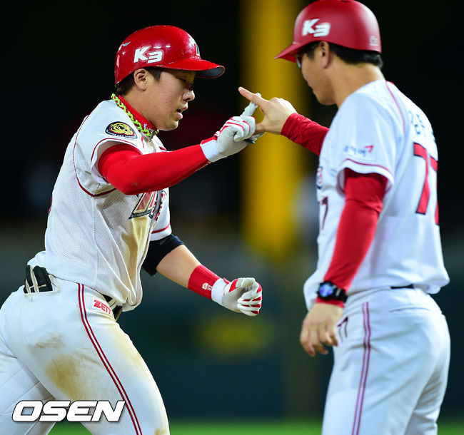 9일 광주-기아 챔피언스필드에서 열린 2014 한국야쿠르트 세븐 프로야구 KIA 타이거즈와 롯데 자이언츠의 경기, 8회말 1사 만루 KIA 안치홍이 만루홈런을 날리고 김종국 코치와 하이파이브를 하고 있다.