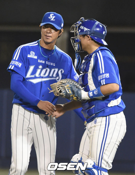 경기 종료후 삼성 임창용과 이지영 포수가 승리으 기쁨을 나누고 있다./ ajyoung@osen.co.kr