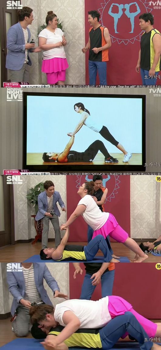 이국주, 김민교는 9일 오후 방송된 tvN 예능프로그램 'SNL 코리아'에서 커플 요가 콩트 호흡을 맞추며 웃음을 자아냈다.