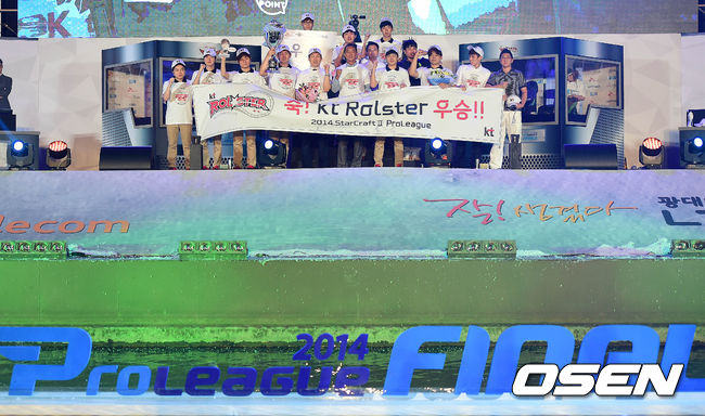 스타1 시절인 2011년 우승 이후 3년만에 결승무대에 오르며 정상탈환에 나선 KT는 9일 서울 반포동 세빛둥둥섬 야외무대(예빛섬)에서 열린 'SK텔레콤 프로리그 2014' SK텔레콤과 통합결승전서 간판 스타인 이영호와 김대엽, 전태양이 제 몫을 다해내면서 4-2 완승을 거두고 우승컵을 품에 안았다.