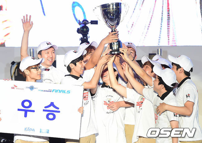 스타1 시절인 2011년 우승 이후 3년만에 결승무대에 오르며 정상탈환에 나선 KT는 9일 서울 반포동 세빛둥둥섬 야외무대(예빛섬)에서 열린 'SK텔레콤 프로리그 2014' SK텔레콤과 통합결승전서 간판 스타인 이영호와 김대엽, 전태양이 제 몫을 다해내면서 4-2 완승을 거두고 우승컵을 품에 안았다.