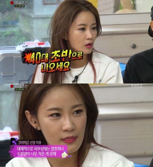 김지민은 9일 오후 방송된 KBS 2TV 예능프로그램 '인간의 조건'에서 의사로부터 "피부에 수분이 제일 적다"며 "수분 함유량이 40대 초반으로 나온다"는 통보를 받았다.