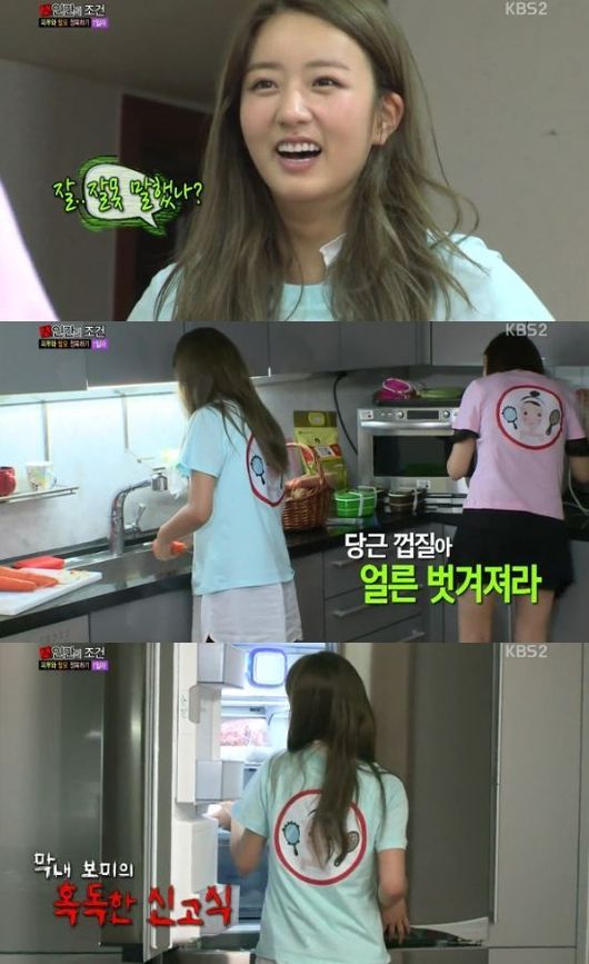 윤보미는 9일 오후 방송된 KBS 2TV 예능프로그램 '인간의 조건'에서 막내로서 언니들을 보필하며 당근 손질하기를 도맡아했다.