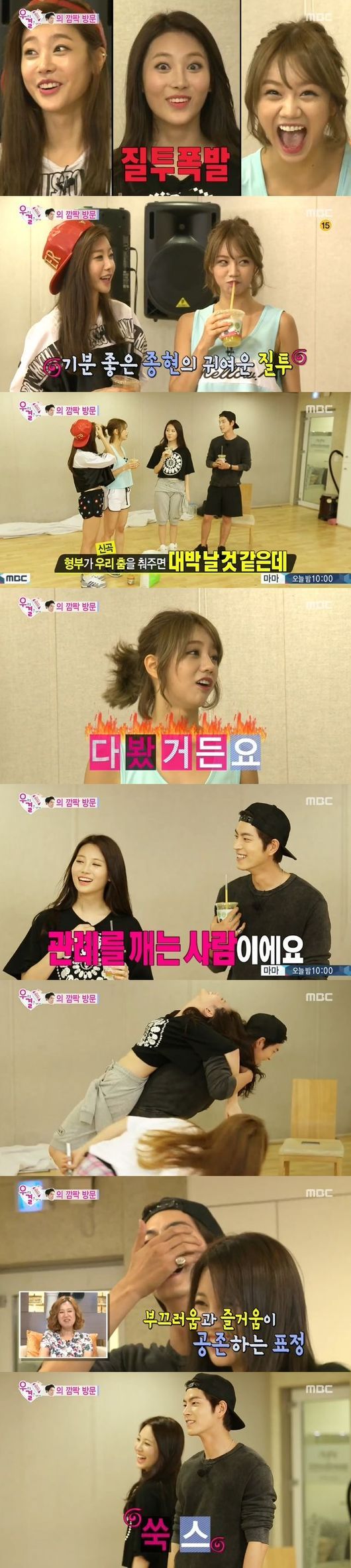 또 걸스데이 멤버들은 “다음주에 우리가 컴백이다. 형부가 우리 춤을 추시면 우리 대박날 것 같다”며 홍종현에게 자신들의 춤을 따라해 볼 것을 요구했다. 그러나 이미 걸스데이의 춤을 보고 충격에 주저앉은 홍종현은 걸스데이의 계속되는 요구에 “나보고 지금 엉덩이를 흔들라고 하는거냐?”라고 말하는가 하면 스트레칭을 하자는 제안에는 “나는 스트레칭 때문에 태권도를 그만뒀다”, 태권도를 보여 달라는 제안에는 “정관지르기”라며 걸스데이에게 갑작스런 공격(?)을 하는 이례적이고 충동적인 모습으로 당황한 속내를 고스란히 드러내 웃음을 줬다.