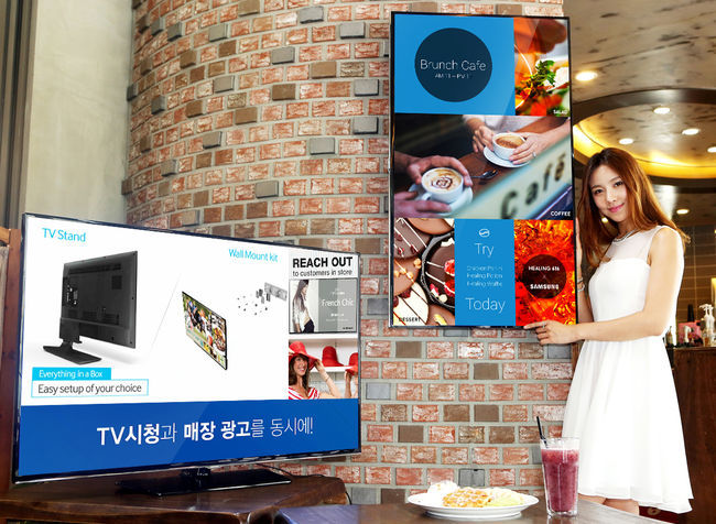 삼성전자 모델이 중소형 자영업자들을 위한 새로운 타입의 비지니스TV '삼성 스마트 사이니지 TV'를 소개하고 있다. /삼성전자 제공.