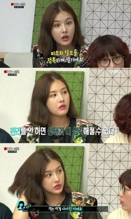 박은지는 지난 9일 방송된 KBS 2TV '인간의 조건'에서 '피부 & 탈모 저복하기' 미션을 받고 "원형 탈모 증상이 있다"고 밝혔다.