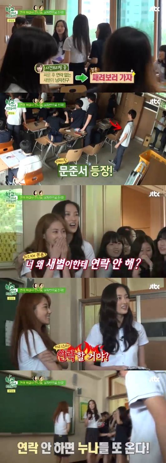 이날 허가윤은 김종민과 브라이언 반에 있는 반 친구 새별이의 남자친구가 싸운 후 연락을 하지 않는다는 이야기를 들었다. 이에 허가윤은 혜박과 함께 새별이의 남자친구가 있는 2반으로 가서 째려보고 오자고 했다.