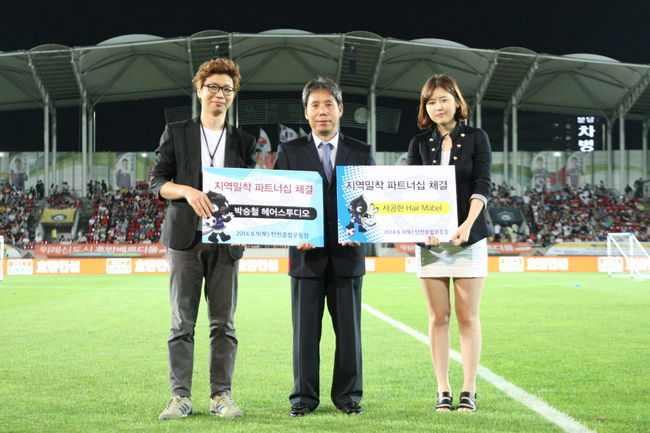 성남FC는 9일 탄천종합운동장에서 열린 전북 현대와의 K리그 클래식 하프타임 때 사공현 헤어마벨, 박승철 헤어스투디오 야탑점과 업무 협약식을 진행했다.