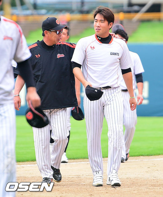 10일 광주-기아 챔피언스필드에서 열리는 2014 한국야쿠르트 세븐 프로야구 KIA 타이거즈와 롯데 자이언츠의 경기전 롯데 모토니시 코치와 전준우가 이야기를 나누고 있다
