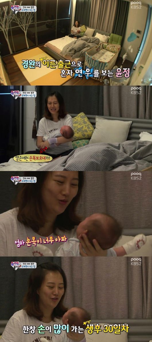 '슈퍼맨'의 장윤정이 아들 연우를 돌보다 손목보호대까지 했다.